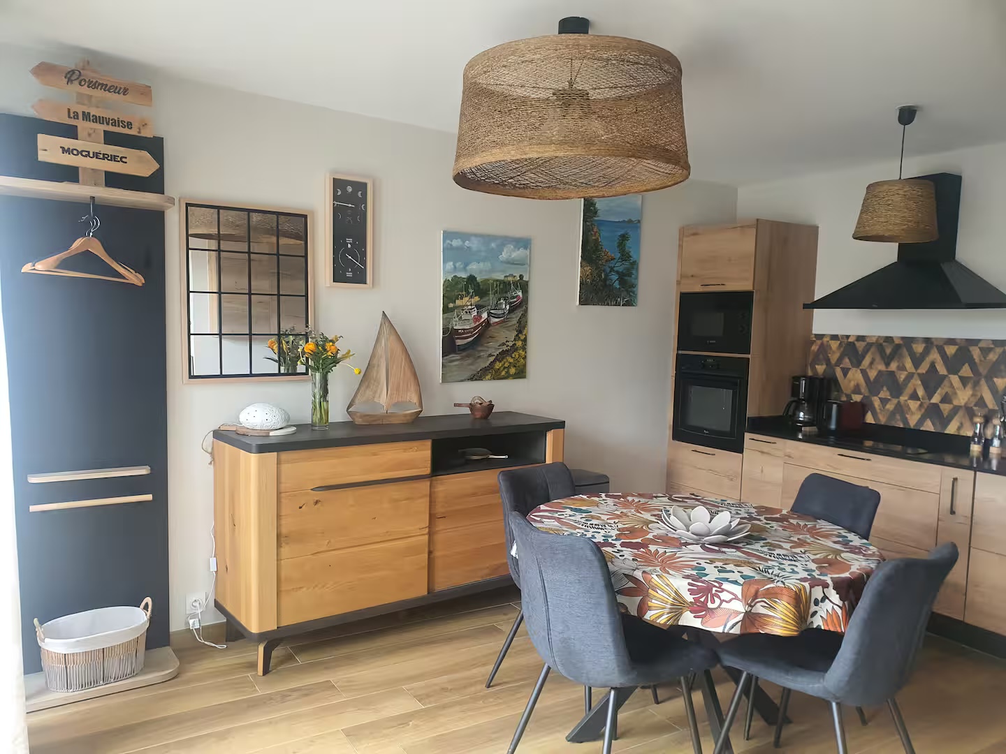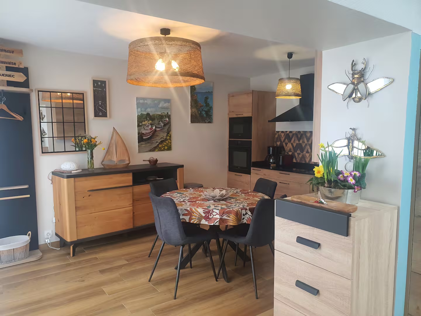 Charmante maisonnette de 60 m2 avec jardin, à 200 mètres de la plage, cosy, chaleureuse. Grand séjour avec cuisine équipée, salle à manger, salon avec insert feu de bois, petit bureau, une chambre avec literie de haute qualité (lit 140cm) et grande salle de douche lumineuse.